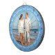 Custom Photo Dartboard template with personalized text and MANCHESTER CITY BLUE 6CADDF round photo framing surround (other color surrounds available in store). Your face on a dartboard. One click personalize upper and lower text plus replace image, or full customization via Edit Screen. Regulation size with metal frame and 6 brass darts (Stars and Stripes + Union Jack flights). A fun gift for a darts player.