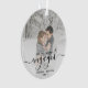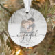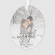 Commemorate your engagement with this beautiful modern keepsake ornament. The black text reads "Our first Christmas engaged," with the word "engaged" in elegant handwriting script with flourishes before and after. Replace the sample image with your favorite photo, and add your names and the year. A white gradient filter helps make the text pop.