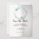 A modern and simple invitation with a picture in a turquoise flower wreath. The background is gradient white and gray