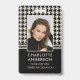 Create your own professional ID badge. This editable design features the iconic houndstooth pattern, paired with contrasting stripes. Upload your profile photo and personalize the template with your name, job title, company, contact details, and QR code. This custom badge is suitable for workplace identification, customer-facing roles, security, networking, conferences, and any role requiring visible identification. It offers fully customizable text to fit your business brand and is ideal for a wide range of work settings, including fashion stylists, beauty consultants, creative directors, interior designers, corporate professionals, retail staff, store employees, hospitality, small businesses, and many more. Printing colors: black and off-white.