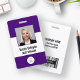 This badge features a simple, modern purple and white background for a professional look. Customize it with your square photo, name, job title, logo, company name, address or other information, and optional barcode.