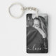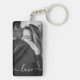 Custom keychain features a favorite photo(s) with a white "love" script overlay design that includes elegant flourishes. The white text can be modified to your favorite saying, font or color. You can choose one photo or opt to have one photo on the front and another on the back to make this uniquely yours. Order today for yourself or to give as the perfect gift for that special person.