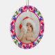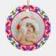 Custom Photo Merry Christmas Modern Colorful Round Ceramic Ornament. A festive, jolly and bright Christmas pattern decorstion for your Christmas Tree. Add your own two photos to celebrate family memories. For budget friendly maximalist Christmas home decor keepsake presents. In traditional, warm Christmas colors of red, pink and orange, with winter green and blue. Makes a great, budget friendly gift for family.