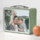 This is a standard metal lunchbox that appears to work just fine. We designed this box ourselves with an uploaded photo and custom text on the front and back. It looks absolutely beautiful except the front of the lunchbox is not centered like it shows in the photo. The print borders don't align with the inset flat part of the box where the preview photo online showed it perfectly centered in there. The back looks nice and centered though.