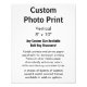 Custom Photo Print blank customizable, personalized custom print photo print template - 8" x 10" vertical (portrait) Kodak Professional Photo Paper (Satin) photo print, developed specifically for darkroom printing, Kodak photographic paper is a premium silver-halide photo paper that is designed to dramatically enhance your picture colors, while still maintaining a consistent tonal reproduction, all photo prints available in dozens of custom metal or color toned wood frame options, (made in America with 100% Ash wood) and hand-fitted by a team of professional framers, with mat (mount, card frame) and frame glazing options available - for photo, image, text, or your own customized design creation. CUSTOM PHOTO PRINT (BULK BUY DISCOUNT PRODUCT) MULTI PURCHASE SAVINGS: 4 photos. (Save 10%) 51 photos. (Save 15%) 101 photos. (Save 20%) Note: Check the drop down options on Item Quantity 'Qty' button for current discounts on specific numbers ordered. Multi purchase savings refer to .com rates - discounts on multiple orders from other country specific Zazzle sites may differ or may not be available. All stated discounts are correct at time of input and are subject to change. ADD A STANDARD FRAME: Black Wood STANDARD FRAMES are made of 100% wood and are a very affordable finishing touch! Standard frames come ready-made in many standard sizes, and so are available only on standard size photo prints but not custom sizes, which will require your choice of wood or metal CUSTOM FRAME. Depending on the dimensions of your photo print, there may be options of mount, mat, card frame to surround your photo print within the frame. ADD A CUSTOM FRAME: Custom frames are hand-made by pro framers and are therefore available for any standard or custom size photo print. Featured in wood and metal styles, custom frames are a perfect complement to your art. Depending on the dimensions of your photo print, there may be options of a first and second mount, mat, card frame to surround your photo print within the frame. Your also have the option of Acrylic, Acrylic (Non-Glare) or Acrylic (UV-Protection) glaze applied to your choice of frame. CUSTOM FRAME GLAZING OPTIONS: ACRYLIC: The most basic type of glazing, this clear sheet of acrylic is firm enough to avoid bending in the frame. Standard acrylic glazing works to protect your image from dust and dirt, and is more impact-resistant than glass, so you don't have to worry if the picture falls down. It is perfect for use in children's rooms and in high-traffic areas of your home or office. ACRYLIC, NON-GLARE: Lightly etched to produce a surface pattern that diffuses reflections, non-glare acrylic glazing makes your artwork easier to view. With a matte finish, this glazing option can be useful when your art is placed in a brightly-lit area. ACRYLIC, UV-PROTECTION: Designed for conservation, acrylic glazing with UV-protection keeps your image from fading, yellowing, and brittling as a result of exposure to direct sunlight and artificial light. The best option for framing your museum quality fine art and photographs, UV-protection acrylic filters out the damaging UV-rays to make your art enjoyable for many years to come. CUSTOM WOOD FRAME COLOR & SIZE OPTIONS (some options may not be in stock): Cherry Frame (1 1/4") Honey Oak Frame (1 1/4") Country Honey Frame (1 1/2") Black Coffee Frame (1 1/8") Black Coffee Frame (1 1/2") Sunset Gold Frame (1 1/8") Whitewash Frame (1 1/4") Honey with Rope Frame (1 1/4") Gold Ornate Frame (1") Walnut with Rope Frame (1 1/4") Antique Silver Ornate Frame (1") Barnwood Olive Green Frame (1 1/2") Barnwood Mocha Frame (1 1/2") Satin Black Frame (1 3/8") Country Honey Frame (2") Sunset Gold Frame (2") Black Coffee Frame (2") Traditional White Frame (1 1/4") Rainbow White Frame (7/8") Rainbow Red Frame (7/8") Rainbow Green Frame (7/8") Rainbow Royal Blue Frame (7/8") Rainbow Canary Frame (7/8") Rainbow Orange Frame (7/8") Rainbow Lavender Frame (7/8") Rainbow Navy Blue Frame (7/8") Rainbow Black Frame (7/8") Sunset Gold Frame (1 1/2") Walnut Starflower Frame (7/8") Sunset Gold Frame (1 1/2") Bronze Scoop Frame (1 1/8") Charcoal Scoop Frame (1 1/8") Country Honey Frame (1 1/8") Country Honey Frame (1 1/2") Black Coffee Frame (1 1/2") Plum Ornate Frame (1 1/2") Tan Rustic Frame (1 1/4") Brown Rustic Frame (1 1/4") Black Rustic Frame (1 1/4") Gold Ornate Frame (1 1/2") Pewter Ornate Frame (1 1/2") Gold Ornate Frame (2") Antique Silver Ornate Frame (2") Walnut Two-Tone Frame (1") Honey Two-Tone Frame (1") Basic Black Frame (1 1/4") Basic Natural Frame (1 1/4") Basic Mahogany Frame (1 1/4") Basic Fruitwood Frame (1 1/4") Basic Black Frame (3/4") Basic Natural Frame (3/4") Basic Mahogany Frame (3/4") Basic Fruitwood Frame (3/4") Basic Walnut Frame (3/4") Matte Black Frame (1 3/4") Natural Frame (1 3/4") Mahogany Frame (1 3/4") Fruitwood Frame (1 3/4") Walnut Frame (1 3/4") Heavily Distressed Black Frame (1 1/2") Distressed Black Frame (1 1/2") Distressed Walnut Frame (1 1/2") CUSTOM METAL FRAME COLOR & SIZE OPTIONS (some options may not be in stock): Matte Black Metal Frame (7/16") Bright White Metal Frame (7/16") Mosaic Blue Metal Frame (7/16") Chinese Red Metal Frame (7/16") Anodic Black Metal Frame (7/16") Graphite Metal Frame (7/16") Frosted Walnut Metal Frame (7/16") Gold Metal Frame (7/16") Frosted Gold Metal Frame (7/16") Frosted Silver Metal Frame (7/16") Silver Metal Frame (7/16") Burnt Sienna Metal Frame (7/16") Matte Black Metal Frame (1 3/8") Brushed German Silver Metal Frame (1 3/8") Florentine Grey Metal Frame (1 3/8") Florentine Walnut Metal Frame (1 3/8") Black Metal Frame (1 3/8") Brushed Antique Gold Metal Frame (1 3/8") Brushed Satin Chocolate Metal Frame (1 3/8") CUSTOM FRAME MAT, MOUNT, CARD FRAME OPTIONS (In order from most popular): White Conservation Mat Antique White Conservation Mat Sand Conservation Mat Ivory Conservation Mat Buff Conservation Mat Yellow Conservation Mat Pink Conservation Mat Light Blue Conservation Mat Black