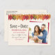 Spread the word with a "Save The Date" announcement for your autumn wedding featuring your custom photo and a border of colorful fall leaves and firefly lights on a string. Replace the placeholder photo with your special horizontal photo. Personalize the text in the template fields or click customize to select a font style, size, and color you prefer.