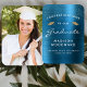 Help your graduation guests keep cool during the ceremony or party with these custom photo graduation hand fans, featuring the words "Congratulations to our Graduate" in white text on a teal blue faux brushed metal background. The word "Graduate" appears in a graceful handwriting-style script. A pair of gold faux glitter mortar board caps and a scattering of gold confetti decorate the top portion of the label. Personalize one side with your grad's name, school, and year of graduation. Easily replace the sample image on the other side with a photo of your grad.