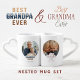 This custom nested mug set is the perfect photo gift for grandparents, featuring a "Best Grandpa Ever" mug and a "Best Grandma Ever" mug. The set includes two white ceramic mugs with unique heart-shaped handles, designed to be paired. Easily upload a cherished photo to each mug and customize the signature line. The full photo and decorative text design is printed on both sides of each mug. This thoughtful, practical gift is ideal for Grandparents Day, Christmas, birthdays, Mother's Day, or Father's Day. © Kimbellished, LLC