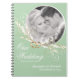 Our Wedding -- Romantic personalized spiral-bound notebook can be used as a guest register for small weddings and brides on a budget. Traditional vintage-style custom photo template with leafy floral frame on mint green background, gold wedding rings, and beautiful script lettering. Customize the names of the bride and groom, add the wedding day, or add your custom text and create your own keepsake journal. Click "Customize It" to edit the font styles and color, or easily change the text fields for alternate bridal accessories such as wedding planner, shower favors, unique gifts for Mother of the Bride, Maid of Honor, Bridesmaids, or as a personal wedding planner for keeping notes and lists organized. Custom personalization available for matching postage stamps. greeting cards, magnets other gifts upon request. Illustration © Teri Francis. Wedding Organizer Binder also available upon request.