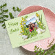 This cheerful Easter card design is the perfect way to send your wishes to family and friends! It features a personalizable photo frame surrounded by bright yellow Easter daisies, two cute little birds perched atop the flowers, and a duck wearing a bowtie! The vibrant colors and whimsical design make this card a delightful way to send your warm Easter wishes.