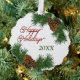 Contemporary Christmas holiday season ornament card with classic 'Happy Holidays' greeting wish on rustic green pinecone pine needles branches wreath motif on a crisp white background. With the option to customize or personalize with your family name and (limited) text of your choice.