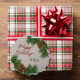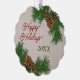 Contemporary Christmas holiday season ornament card with classic 'Happy Holidays' greeting wish on rustic green pinecone pine needles branches wreath motif on a faux taupe beige brown textile weave pattern background. With the option to customize or personalize with your family name and (limited) text of your choice.