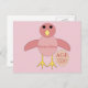 This postcard features a cute cartoon of a pink chick. The chick has a pale pink belly and darker pink wings and head with a yellow beak and feet. Next to the chick is a small egg.