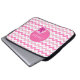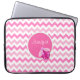 Stylish 15" laptop case done in a pink and white zigzag chevron pattern. Graphics of a pink and white round disc, in the center of the case, has a cute pink ladybug and custom white script text. Personalize the text for yourself or as a cute gift idea for any age girl.