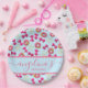 Celebrate in style with this adorable birthday paper plate, customized with "Angelina’s Birthday" in playful script. Featuring pink frosted cute donut and bows pattern and golden fireworks on a pastel blue background, this plate is perfect for donut-themed parties, kids' birthdays, or girly celebrations. Durable and colorful, it's both fun and functional for your party table. Personalize for any name and make every party extra sweet!