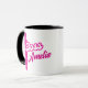 This mug has a simple yet impactful silhouette of a boss lady in action. The silhouette showcases the distinctive outline of a woman sporting a boss babe look. The font is fun and reminiscent of our favorite pink doll. Use the template to change the name. The other side of the mug features a place to add in your favorite quote about leaders, or if this is a thank you gift add in a special note.