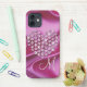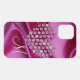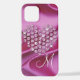 Contemporary faux shiny diamond heart on a bright hot pink colored printed image of wavy satin fabric. With room to customize or personalize with a monogram of your choice. Beautiful, modern, and cool cover for the trend-savvy and art-loving hip trendsetter, artsy motif lover who wants to protect their phone from dust and dirt, wear and tear. This design is available in Apple iPhone 6, 7, 8, 10 or X, XR, XS, 11, 12, 13 Mini, 14, 15 Plus, and Pro Max cellphone cases. Show off your style, look fashionable trendy, and feel stylish with a unique design on a mobile device accessory of your choice.