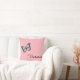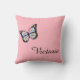 A beautiful butterfly has pink, purple, and green wings on this pink throw pillow. Personalize your throw pillow with your name, which will appear in black script.
