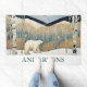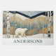 Beautiful artistic custom name door mat with a cute winter forest scene with mountains and a cute polar bear.