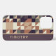 Contemporary eggplant purple, ivory off-white, tan brown, taupe, beige, and olive green colored squares and triangles polygon pattern. With room to customize or personalize with a name, monogram, or initials of your choice. Beautiful, modern, and cool cover for the trend-savvy and art-loving hip trendsetter, artsy motif lover who wants to protect their phone from dust and dirt, wear and tear. This design is available in Apple iPhone 6, 7, 8, 10 or X, XR, XS, 11, 12, 13 Mini, 14, and 15 Pro Max cellphone cases. Show off your style, look fashionable trendy, and feel stylish with a unique design on a mobile device accessory of your choice.