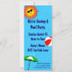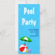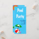 Custom party invitations with a fun swimming pool theme, decorated with a red beach ball, green umbrella, sandals and suntan oil on a watery blue background with curly waves. Click Customize It to change fonts or colors, even save your design for later.