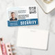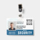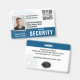 Customizable security badge with a geometric background pattern. Personalize with your ID photo, employee number, job title, company name, logo, issue date, expiration date, and a QR code or barcode. Ideal for various workplaces and professions such as private security guard, close protection officer, store security, personal bodyguard, official doorman, retail worker, medical staff pass, and more. Printed colors: blue, gold, black and white. Shop the collection for more badges and tags for sale online, designed for the security service industry.