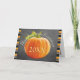 Cute 'Thanksgiving Greetings' text written in pretty typography, an orange Pumpkin on trendy blackboard background, surrounded by bright orange, lime green, white and black horizontal stripes pattern design. With room to customize the greeting on the font, and personalize with your family name and photo of your choice on the inside. Tip: turn this card into a cute photo display by folding it inside out.