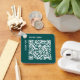 Business keychain features a custom QR code and text on the front, and your logo and text on the back. The text is in a minimal, modern white font on a teal background. Personalize the QR code with a link to your website or offer; add your company name, website, or other text; and upload your logo in the sidebar. White or light colored logos will work best with this design. If you want the background color to show through your logo, upload a version of your logo with a transparent background. Make your business stand out with this great promotional giveaway for customers.