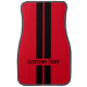 Double racing stripe custom car floor mats. Two bold vertical black stripes on red background. Customize with your own text - add your name, the car's make / model etc. Background color of floor mats is customizable to any color you'd like. Makes a perfect gift for anyone who loves their vehicle and wants to give it a unique, personalized touch.