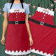 this red mrs. clause / elf holiday apron is straight out of santas workshop. it features a white printed fringe trim on both the top and bottom, a printed black belt, with a metallic faux foil silver / platinum buckle, which sits below two matching silver glitter printed buttons. Easily use the personalize feature to add your name or text and make this classic Christmas Apron truly special. Or completely remove the customizable name all together.