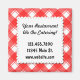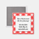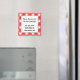 An editable magnet template for your restaurant or food industry business with retro script and block letters and room for two lines of text top and bottom, and a red and white checked background pattern. Customize it to add your name or message, change fonts and more, even save your design for later.