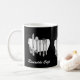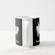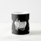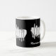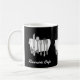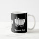 A custom name or restaurant business mug with white script text and a set of silverware on a table napkin embellished in gray on a black background. Customize this design to add your name or logo to this product, change background colors and more.
