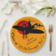 Set of customizable paper plates, each with a vintage Halloween image showing a witch flying in an airplane with her black cat in front of a blood red moon on Halloween night.