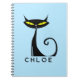 This personalized spiral notebook design features a retro mid century modern "atomic" black cat with big yellow eyes and a curly tail.
