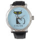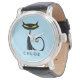 This personalized wristwatch design features a retro mid century modern "atomic" black cat with big yellow eyes and a curly tail.