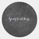 Custom round blackboard chalkboard wedding stickers with elegant script typography. Fancy retro look design for vintage style marriage. Use this template as envelope seals, favor sealers and more. Black and white print with personalizable text. Add your own thank you message, monogram, date or names of bride and groom couple. Pretty DIY accessories for themed wedding, engagement, bridal shower, anniversary etc.