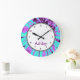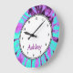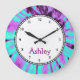 Super cool girly clock has a cool teal and purple tie dye design on the clock face in this decorative wall decor clock that is designed for a girl room, baby girl room, baby boy room or a college door room. Customize the name with whatever you like. You can also change the font. What a Great Gift!