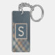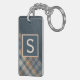Contemporary tan, brown, beige, taupe, and dark teal blue tartan plaid, and a faux leather texture pattern background. With room to customize or personalize with a name monogram or initial of your choice. Beautiful, modern, and cool keychain or suitcase luggage tag for the trend-savvy and art-loving hip trendsetter, artsy motif lover.