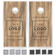 A warm, rustic look for your brand — this custom business logo cornhole set features a rich brown wood grain background with black text. Both boards display your company name above a clean logo placeholder, with space for your location, slogan, or website below. Upload your logo in any color or shape and customize all text fields. Cornhole bag colors shown are gray and navy and can be modified. An impressive branded yard game for corporate picnics, team building events, trade shows, and company parties.