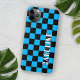 Fun funky black and bright azure blue colored racing flags check pattern design. With room to personalize or customize with a name of your choice in white and black colors. Funky, elegant, stylish, and eclectic design for the fancy artistic fashionista, the artsy fashion diva, popular hip trendsetter, vintage retro art style, and abstract digital geometric motif lover who wants to protect their phone from dust and dirt, wear and tear. This design is available for Apple iPhone 6, 7, and 8 Plus, 10 or X, XR, XS, 11, 12, 13 Mini, 14, 15 Plus, and Pro Max cellphone cases. Show off your style, look fashionable, and feel stylish with a unique design on a mobile device accessory of your choice.