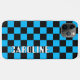 Fun funky black and bright azure blue colored racing flags check pattern design. With room to personalize or customize with a name of your choice in white and black colors. Funky, elegant, stylish, and eclectic design for the fancy artistic fashionista, the artsy fashion diva, popular hip trendsetter, vintage retro art style, and abstract digital geometric motif lover who wants to protect their phone from dust and dirt, wear and tear. This design is available for Apple iPhone 6, 7, and 8 Plus, 10 or X, XR, XS, 11, 12, 13 Mini, 14, 15 Plus, and Pro Max cellphone cases. Show off your style, look fashionable, and feel stylish with a unique design on a mobile device accessory of your choice.