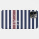 Contemporary dark midnight blue and white stripes pattern. With a banner to customize or personalize with the monogram of your choice. Beautiful, modern, and cool cover for the trend-savvy and art-loving hip trendsetter, artsy motif lover who wants to protect their phone from dust and dirt, wear and tear. This design is available in Apple iPhone 6, 7, and 8 Plus, 10 or X, XR, XS, 11, 12, 13 Mini, 14, 15 Plus, and Pro Max cellphone cases. Show off your style, look fashionable trendy, and feel stylish with a unique design on a mobile device accessory of your choice.