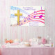 Modern SING HALLELUJAH CHRIST IS RISEN Easter Banner, showing a gold colored empty cross in amongst colorful music staves. The Easter text appears in a mauve color. These words will be sung by Christians the world over to celebrate the resurrection of our Lord Jesus Christ at Calvary. JOIN US FOR OUR EASTER SERVICES is CUSTOMIZABLE text, so you can personalize by adding your name, or making this a generic Sunday Service banner, or adding your church name. This modern Christian Easter banner would make a great welcome sign for your church, organization or private home (with customization) to celebrate Resurrection Sunday. Choose from a wide selection of faith-based Christian Easter designs on cards, invitations, home decor, clothing and gifts, designed by Berean Designs.