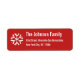Custom, personalized, festive red and white, snowflake, christmas holiday season return address label. Simply enter the family name / bride & groom's / wife & husband's names, and address, to customize.