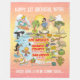 This bright and colorful scene offers a spectacular view of Southern California - wacky characters frolic on the beach and desert of SoCal showcasing Los Angeles, Orange County, San Diego, Santa Barbara, Palm Springs, El Centro, Beverly Hills, Laguna Beach, La Jolla, Anza Borrego, and Joshua Tree parks as well as the border cities of Tijuana, Tecate, and Mexicali. This charming scene has it all – a surfer hangs ten while a killer whale leaps out of the water, a hiker is noticed by a UFO, and much more…
