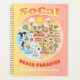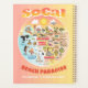 A spectacular cartoon of Southern California – showcasing Los Angeles, Orange County, San Diego. This bright and charming scene has it all – a surfer hangs ten while a couple play in the water, a killer whale leaps up, a muscular beach couple both flex to impress, zoo animals wait for tourists, a t-rex roars a challenge, all beneath the bright California sun shining high above it all.