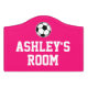 Custom soccer ball door sign for kid's bedroom or baby nursery room. Suitable for boys and girls. Print your own acrylic wall plaque, welcome sign and office door name plates. Personalized signage for children and adults. Make your own personalized signage for entrance and directions. Also nice for school classroom, sports club house, dorm, restroom, washroom, toilet etc. Adhesive sticker on the back for easy placing on walls or doors. Unique facility supplies and DIY printing accessories for interior. Sporty athletic typography name plate template with soccer ball logo. Girly pink or custom color background. Also nice for coach, team, trainer, league, mom, dad etc.