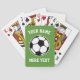 Custom soccer ball and name playing cards. Personalized playing cards for kids and adults. Sporty Birthday gift idea for children, fusbol fan, football player, coach, dad, husband, boy, girl, mom, brother, sister, trainer, friend, co worker, boss, retiree, son, daughter, grandchildren, club owner, bar, pub, cafe etc. Sports theme presents for him or her. Green or custom color background. Great for poker, bridge, go fish, blackjack and other card games.