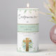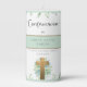 Exquisite personalized "Greenery Boy or Girl Confirmation Candle" in Spanish, decorated with pale blue and mint green leaves borders and gorgeous greenery encased golden cross. Use of modern hand written typography details. Stripe in pale green mint and gold on the center with name. Coordinating Confirmation invitation and event products. Also available in English. Part of our "Unisex Elegant Greenery Religious Event Collection".