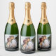 Modern sparkling wine MR and Mrs wedding Photo Labels. This design features of bride and grooms photograph and Mr and Mrs white overlay in trendy lettering.